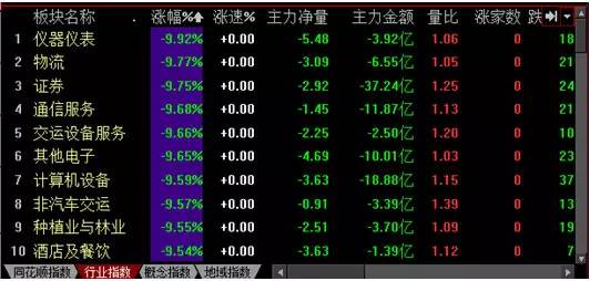 仪器仪表、物流、证券、通信等板块领跌。超过33个板块跌幅均在9%以上。即便损失最小的银行板块,跌幅也接近5%。