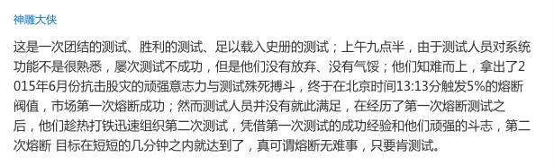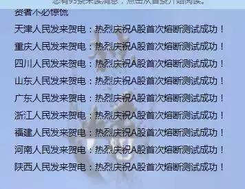 全国股民纷纷发来贺电庆祝熔断测试成功,仅用半天便牢记熔断规则,再也不敢忘了!“记住了吗?”“记住了。”“真记住了?”“真记住了。”“好,那我再让你记牢一点。”