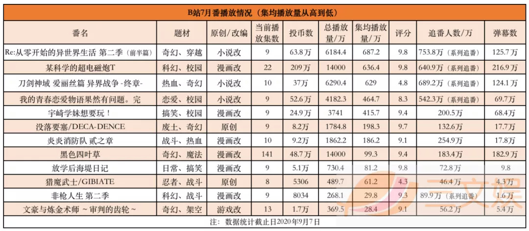 引进的七月新番最终只有24部成功在内陆地区开播。10月临近,这24部作品的播放也接近尾声。从前台显示的播放量看,《Re:从零开始的异世界生活》、《某科学的超电磁炮T》等高人气大IP续集表现突出,且在B站拿到了9.8的高分。