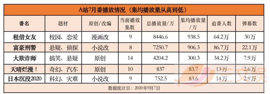 A站今年的7月番都是发挥稳定的新作,《租借女友》和《富豪刑事》两部作品表现出色,《大欺诈师》位列集均播放量排行榜第三,之前备受关注的《日本沉没2020》播放数据却不尽如人意。