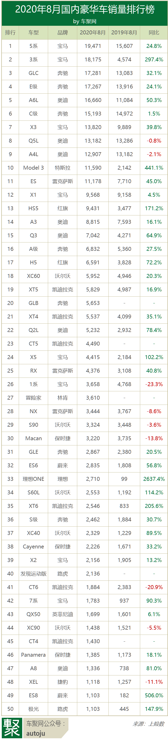 红旗旗下HS5以9,431辆销量排名第13位,相比7月下降一位,而H5排名上升两位至17位;蔚来ES6和理想ONE依次排名第32、33位,8月销量分别为2,835辆、2,710辆。
