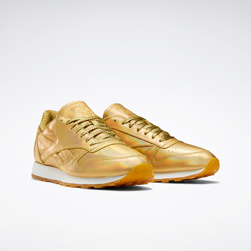 该系列最先亮相的鞋类产品是一双经典皮革运动鞋,鞋的全身以金色为主,金属鞋面搭配金线鞋带,致敬《神奇女侠1984》中的金属盔甲。