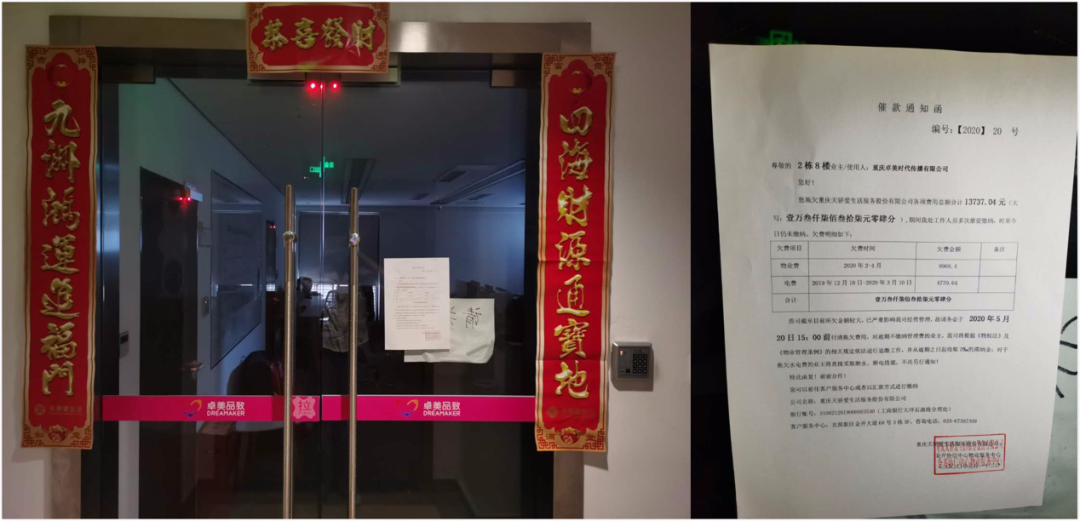 目前卓美重庆校区大门紧锁,门上还贴着一张催款通知函。催款通知函显示,重庆卓美已经拖欠2020年2-4月总共1.37万元的物业费和电费。