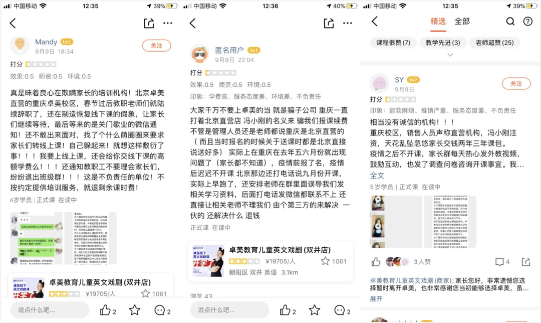 目前在卓美北京校区的大众点评下方,有大量关于重庆和青岛校区关门跑路,不退费的留言和评价。