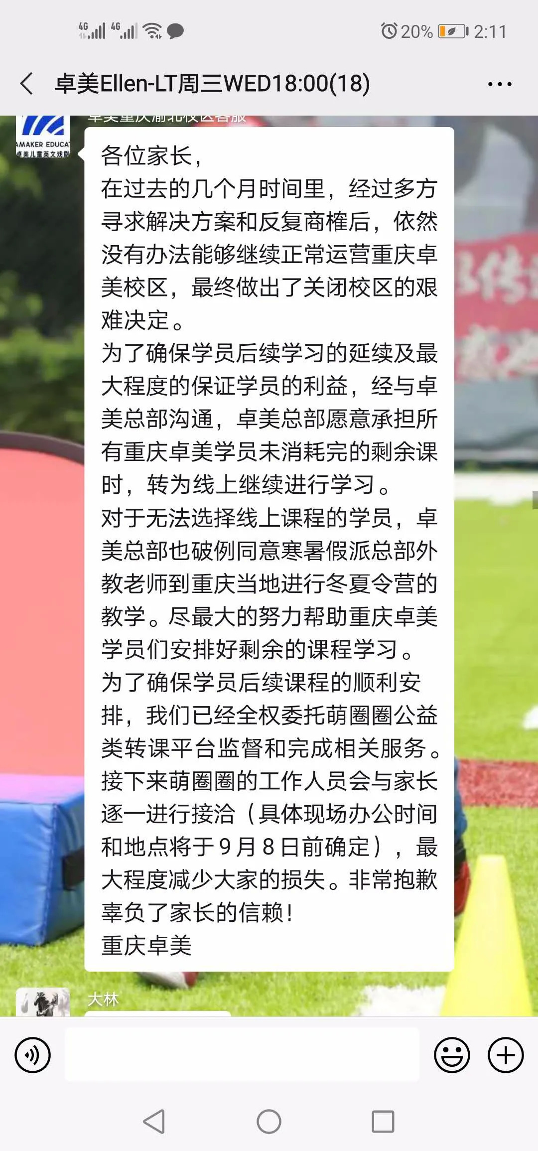9月3日,家住重庆的潘先生突然在微信里接到卓美重庆渝北校区客服发来的一条信息:经过反复商榷,无法继续正常运营重庆卓美校区,最终做出了关闭校区决定。为了确保学员后续学习的延续,卓越总部给出的解决方案是未消耗完的剩余课时转为线上继续学习。并且已经全权委托萌圈圈公益类专科平台监督完成相关服务。