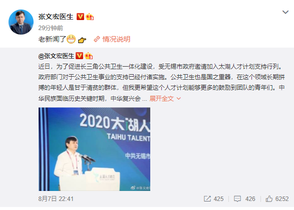 随后,张文宏发布微博表示,网传信息已经是老新闻了。