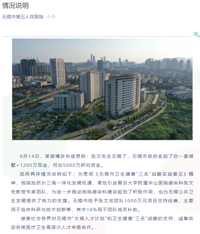无锡市第五人民医院当天回应,具体情况说明如下:为贯彻《无锡市卫生健康“三名”战略实施意见》精神,无锡市第五人民医院抢抓长三角一体化发展机遇,柔性引进复旦大学附属华山医院感染科张文宏教授专家团队,为进一步推动无锡市第五人民医院感染科建设起到了积极作用,也为无锡公共卫生发展提供了有力的支撑。无锡市给予张文宏团队1000万元项目支持经费,主要用于临床科研与技术创新等,其中10%用于团队成员补助。