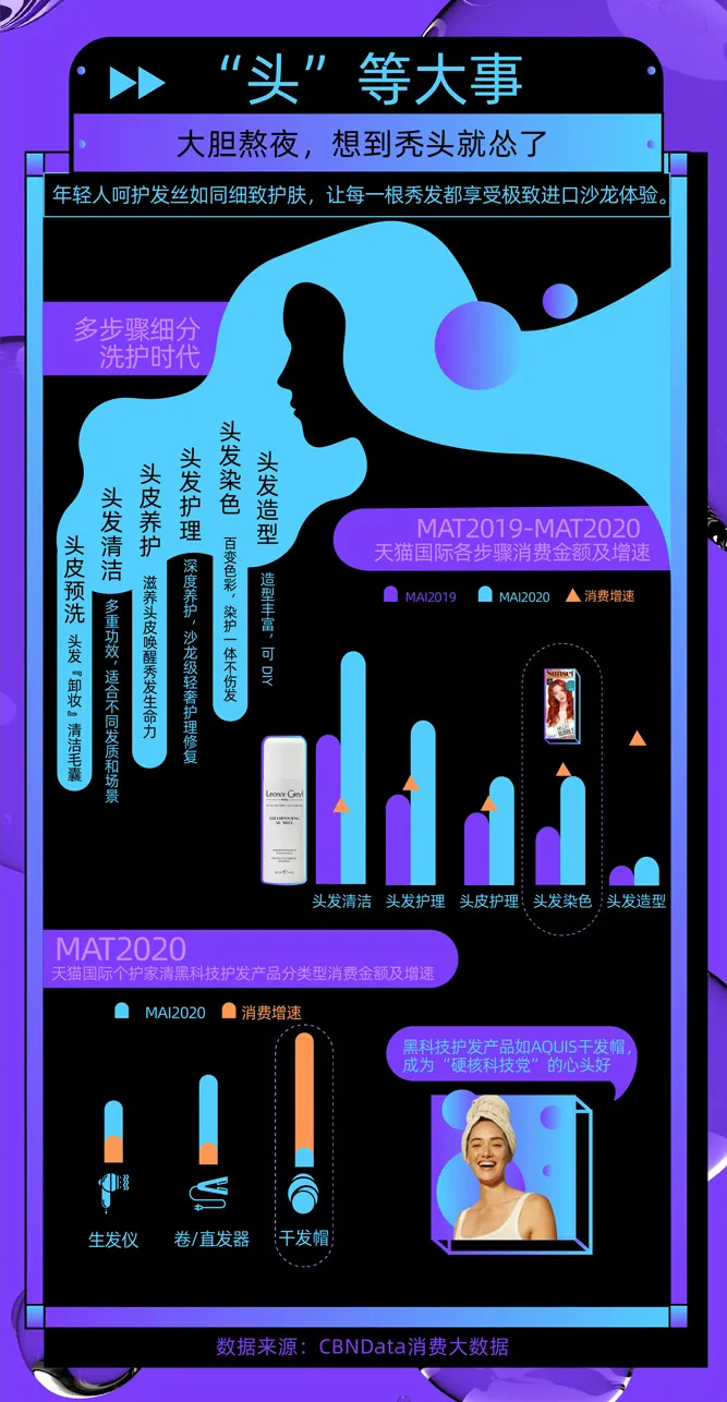 正如我们前文所提到的,天猫国际个护家清行业中,核心品类洗发水和染发膏表现突出,其中染发消费热度快速蹿升。而洗护步骤也越来越细,从头发预洗、清洁,到头皮与头发的护理,再到头发造型的打造,每个步骤都对应不同功能的产品。人们总是一边“烫、染、漂”可劲折腾自己的秀发,一边又细致地挑选不同功效的护理产品来修护头发。