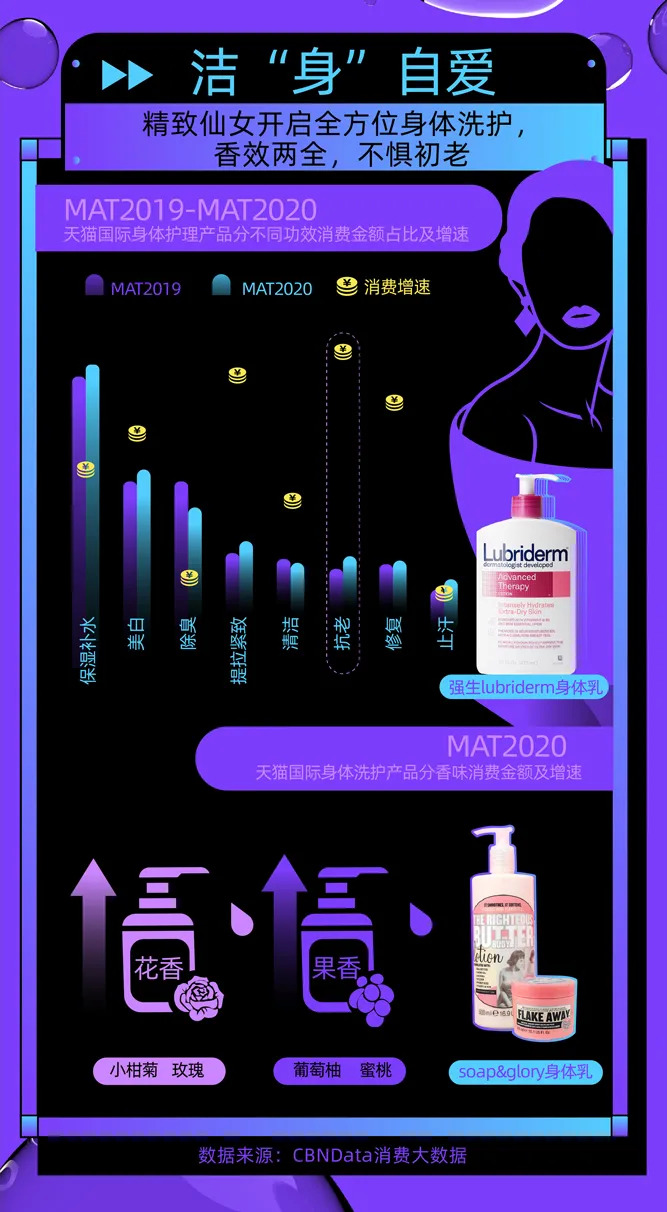 在身体洗护方面,消费者对于身体护理产品的功效有了更高的诉求,比如抗老、提拉紧致、修复皮肤等。含A醇这一抗老成分的护理产品从脸部延伸到身体,为“成分党”们所喜爱。