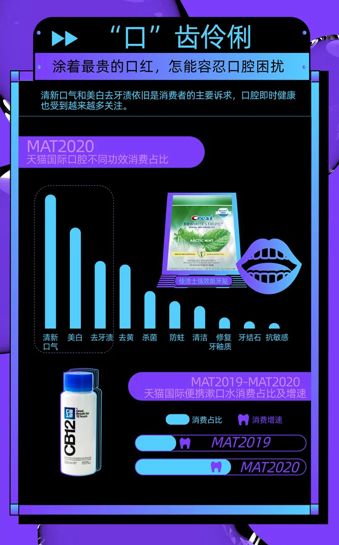 根据《报告》显示,比起身体健康,国民对口腔健康的评分更低。清新口气、美白和去牙渍是消费者们对口腔护理的主要需求。就最近一年来看,便携装的口腔护理产品消费翻了一番,其中便携装漱口水的消费增速达200%。果冻型、条状的漱口水小巧便携,帮助人们随时随地保持口腔清洁,清新口气。