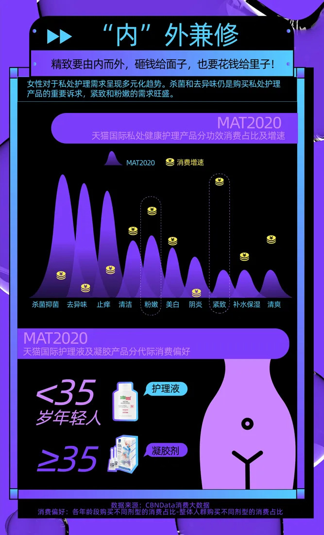 同时,私处护理消费也呈现出一些新的趋势,比如在杀菌、去异味、止痒的主要诉求外,紧致、粉嫩的消费增速较高;除了传统的护理液,凝胶类型的消费占比呈爆发式增长,并集中在35岁以上的消费群体当中。