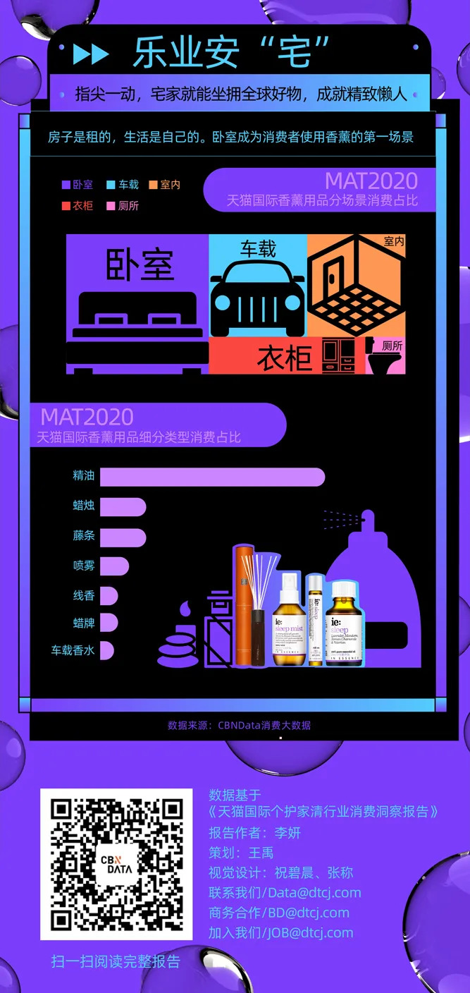 想象周末宅在家的时光,借助各种高效的清洁产品与黑科技电器将屋子打扫得干干净净,然后在房间点上香薰蜡烛,幸福感就会充满整个空间。《报告》显示,在天猫国际香薰用品的消费场景中,卧室占比最高。香薰用品的类别,最主要是精油,其次是香薰蜡烛、香薰藤条等。