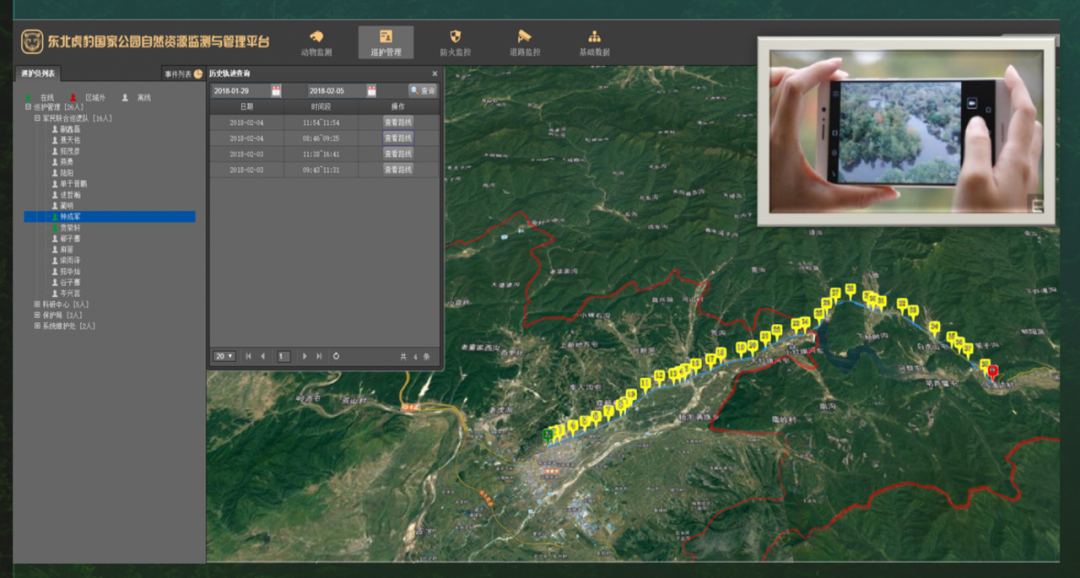 第二,实时监测及信息回传。不仅可以完成红外野保相机图像和高清视频的实时回传,土壤、水质、空气等传感器的生态因子采集回传,还可以实现森林防火和道路卡口监测影像的实时传送。以及实时查询护林员巡护轨迹,实现护林员视频或语音实时对讲等。