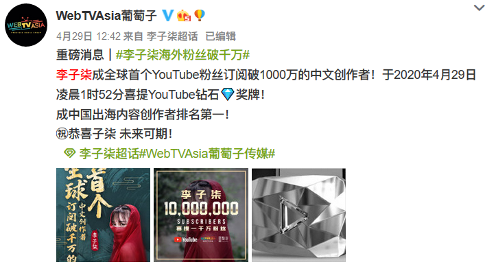 2015年,母公司在马来西亚的葡萄子传媒正式注册葡萄子(北京)文化传媒有限公司,成为国内第一家做创作者出海运营的公司。到今年年初,葡萄子传媒在国内已经签约近600个出海频道,其中包括“李子柒”、“一条”、“敖厂长”等头部IP。
