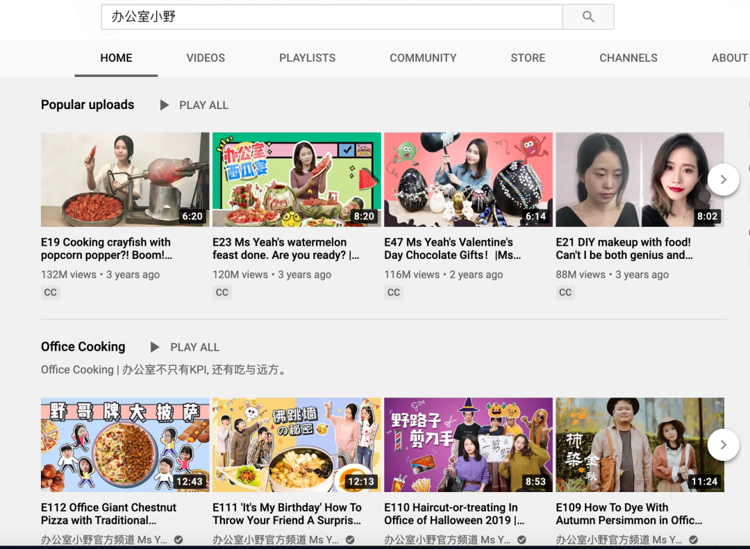 2017年2月,“办公室小野”的第四支视频“饮水机煮火锅”在YouTube上走红,此后这个视频场景发生在办公室,以“创意烹饪美食”,比如针织方便面、挂烫机蒸包子、电钻棉花糖等脑洞大开的操作为核心的博主,迅速成为YouTube上的热门话题。YouTube官方曾对办公室小野认证,她是当年华人创作的内容里粉丝涨速最快的一个。