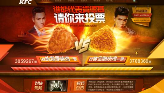 为表示不断推陈出新,满足消费者的不同口味,肯德基决定舍弃招牌产品“吮指原味鸡”,并将此产品暂停销售五周的时间,取而代之的是与德克士类似的一款“黄金脆皮鸡”,此消息一出便遭到了诸多消费者的议论和不满。最后,肯德基用突破性的明星代言,用消费者网络投票的形式将陈坤代言的吮指原味鸡与柯震东代言的黄金脆皮鸡进行PK,并以吮指原味鸡的胜出恢复了它的身份。
