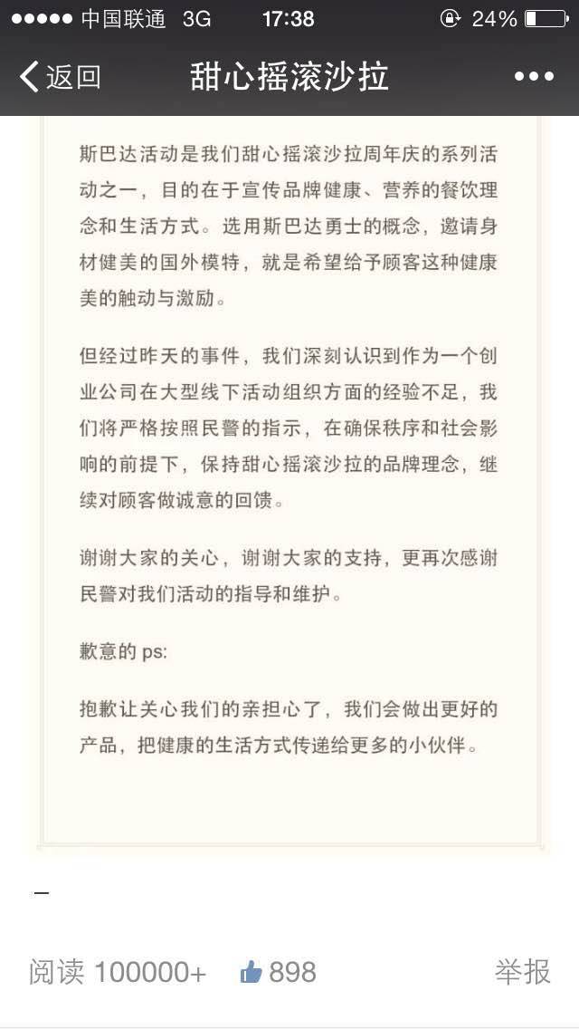火热程度引起营销质变,制造了全国性新闻事件,这是甜心“心机”三步走。最后,幕后黑手甜心摇滚沙拉发布了一篇道歉声明,以危机公关行为保持了品牌形象并将事件推向了高潮,并冲出中国被169家外媒报道,甜心“心机”四步走到此才消停会儿。