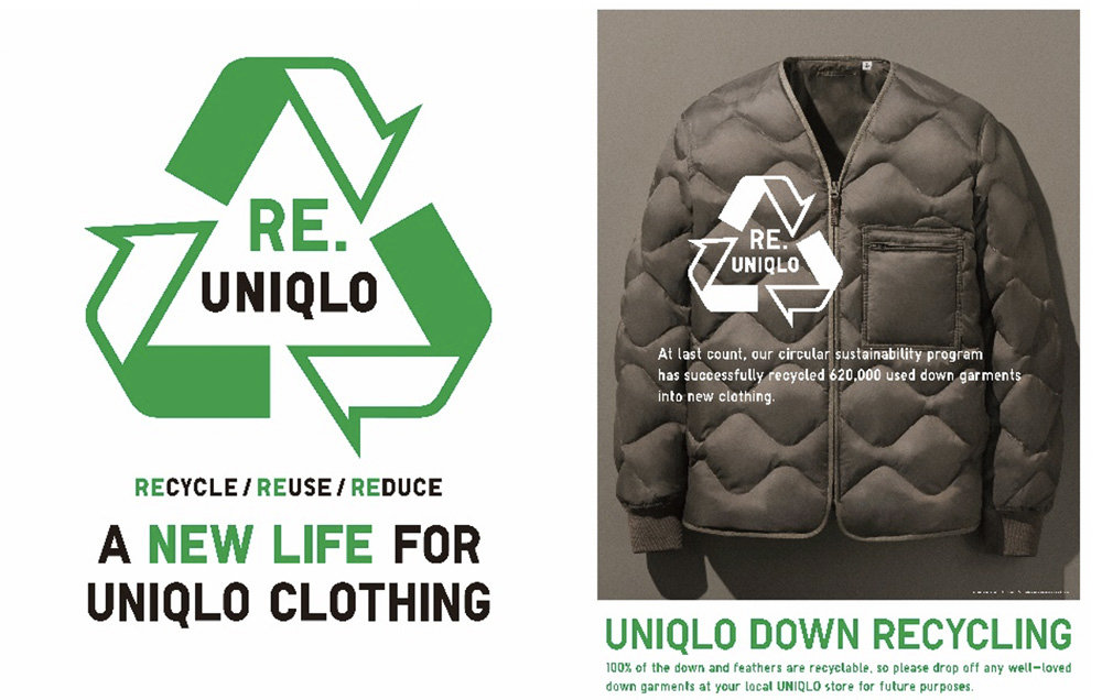 Re. Uniqlo 的回收计划中的第一个项目名为“Down Recycling”,优衣库的首要目标是从2020秋季开始在全球范围内开展“Down recovery”活动,与世界各地的客户合作,实现提供更可持续羽绒产品的承诺。