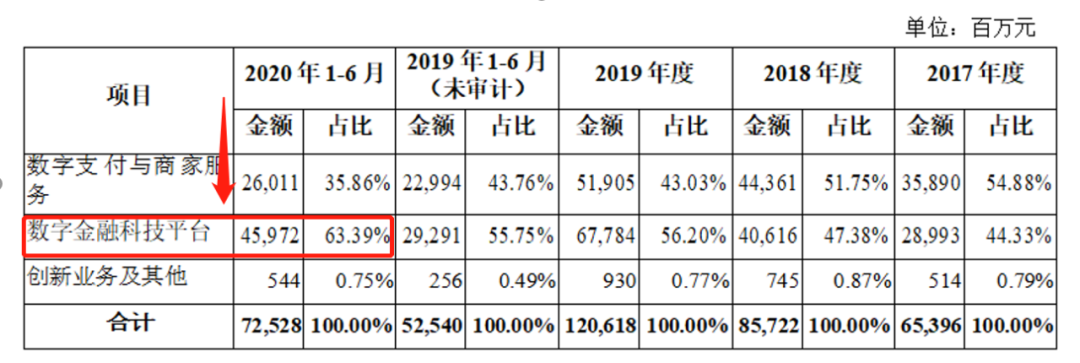 招股书显示:从2019年开始,蚂蚁集团覆盖花呗、借呗等借贷业务的“数字金融科技平台”收入占比超过支付业务,成为收入大头。