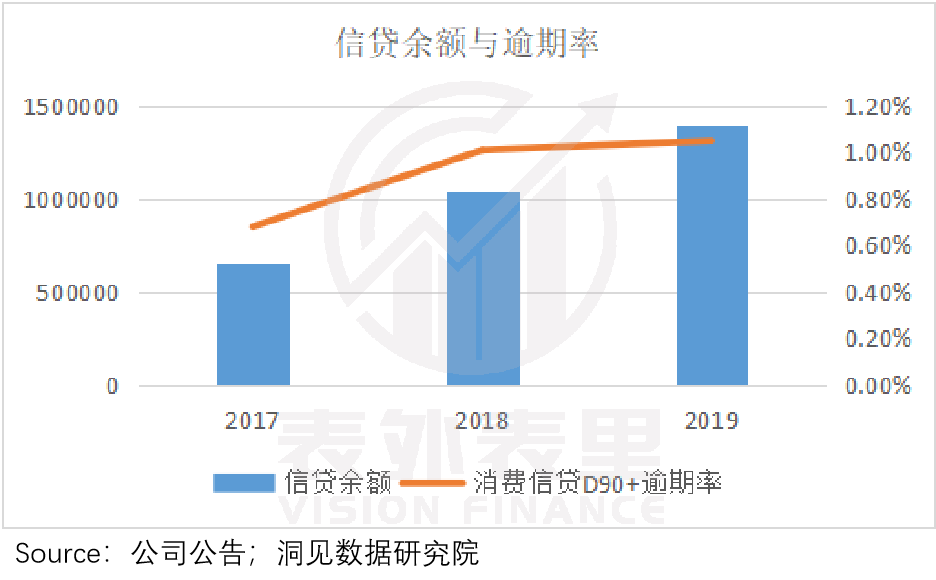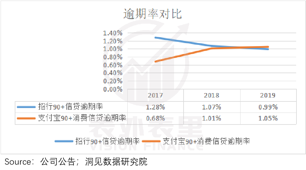 前文我们已经与招商银行进行了逾期率的对比,不妨再回顾一下。2019年,招行90天以上的信贷逾期率为0.99%,支付宝是1.05%,两者差距很小。