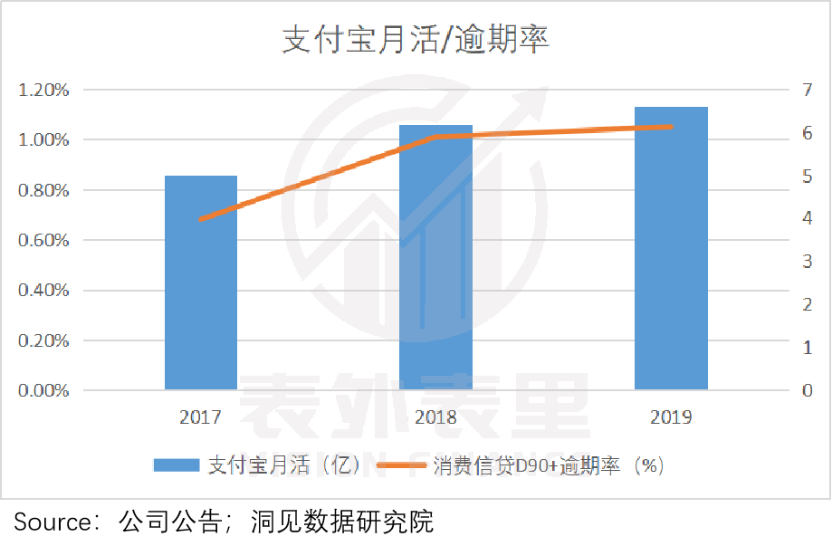 数据显示,从2017年到2019年,支付宝月活人数上涨了1.6亿人。但从2017年到2019年的90天以上消费信贷逾期率并未出现大幅上升,始终保持在1%左右。