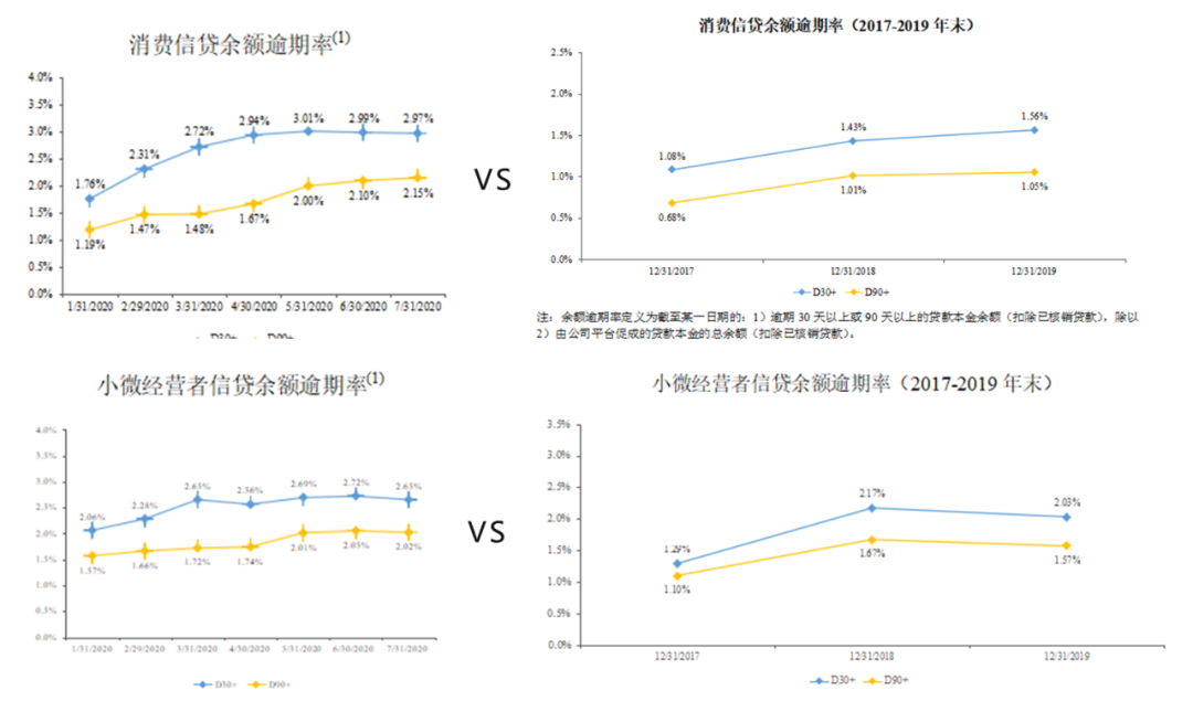 不论是消费信贷逾期率(90天以上),还是小微经营者信贷逾期率(90天以上),2020H1与2017-2019年的数据相比,都有明显的上升。