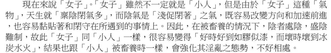 不信,看看这篇东吴大学社会学系副教授蔡锦昌的论文节选,他说:女子这种“气物”,天生“阴闭气多”……“盛阴难制”,所以女子与小人一样,容易阴晴不定,不好相处。