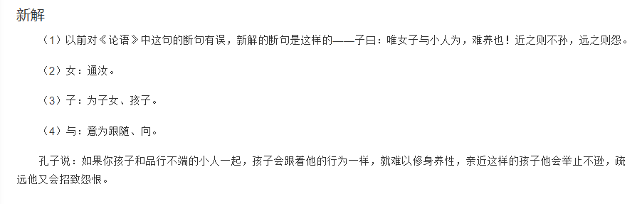 最后,不知道什么时候出现了对这句话的“新解”,说女通“汝”,是“你”的意思,“子”是孩子,小人还是那个小人,所以这句话是说“你孩子与小人玩的话,就难养了”。