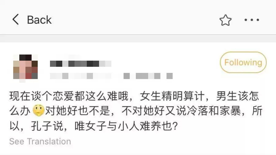 我不接受,因为这句话在现代的每一次使用,都使得它无法只在春秋语境中真空存在。就像我的一位女生朋友说,这句话早就脱离了孔子本身的存在,具有一种超越历史的厌女力量。比如,当一个现代男性家暴妻子的时候,他也可能用这句话给自己开脱。