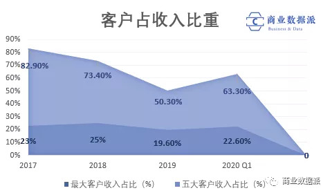 在流量至上的互联网时代,乐享做到的量确实看上去不错,但实际上,乐享不论是客户还是供应商,都存在过度集中的问题,2017年、2018年、2019年及2020年第一季,乐享的五大客户占其收入比重分别为82.9%、73.4%、50.3%及63.3%。