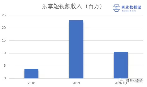 乐享目前也在布局短视频业务,但目前看来营收占比还是非常少,2018年开始布局,但2019年、2020年一季度的营收占比仅有5.6%和6.4%,增长速度也不快,今年第一季收入也只有1067万元。