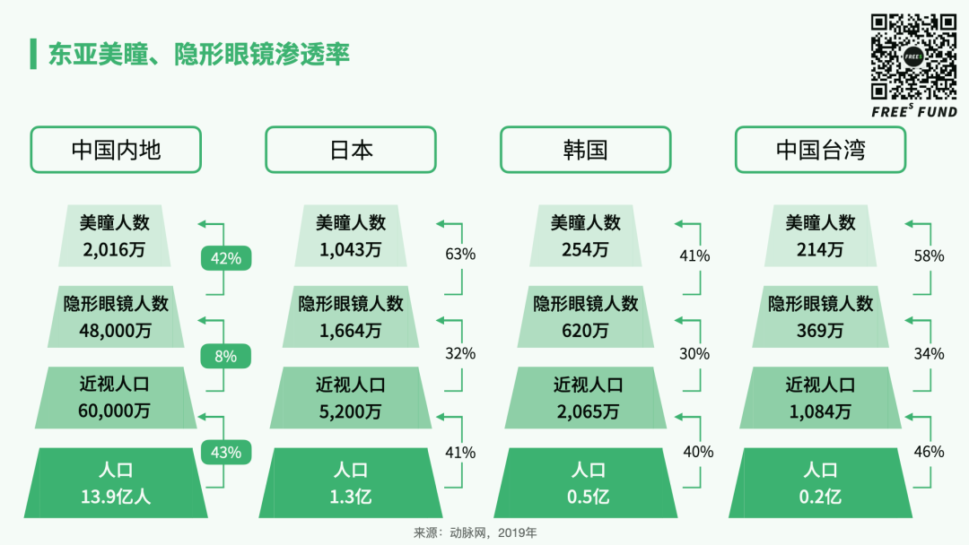在中国,包括美瞳在内的隐形眼镜是一个正在爆发的增量市场。相比亚洲其他国家,中国隐形眼镜使用的渗透率处于较低水平。