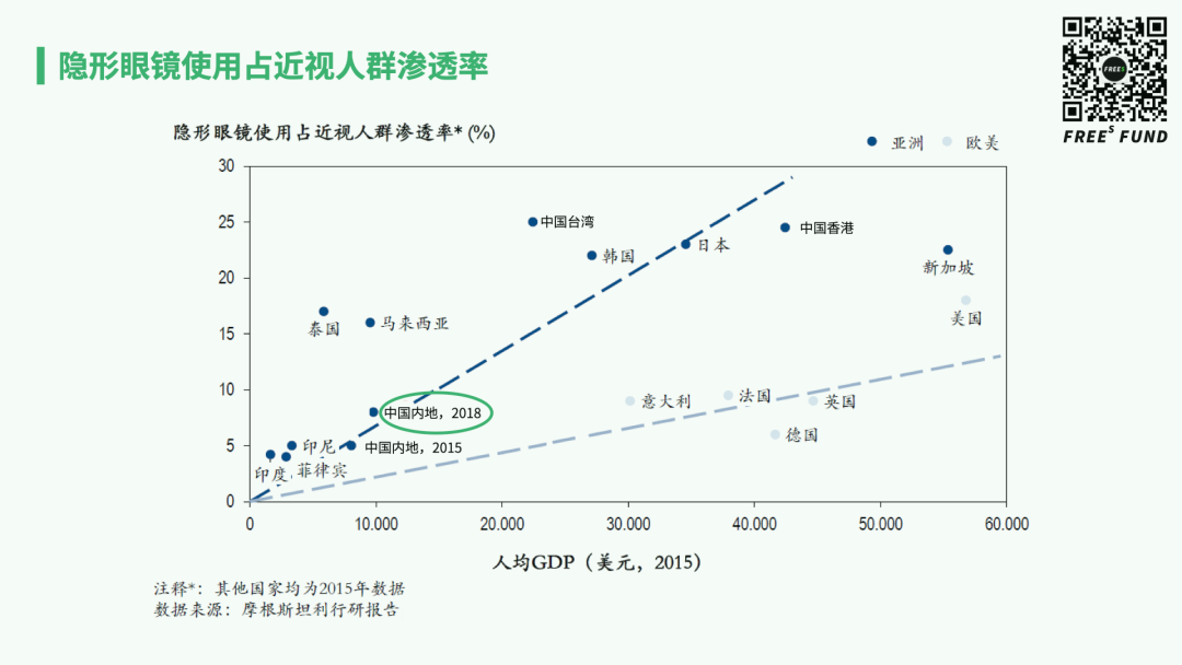 趋势三:隐形眼镜佩戴率会随着国家经济水平的提高而提高。摩根斯坦利的行研报告显示,中国不仅是世界上视力矫正人口比例最高的国家,且年轻人近视率逐年上升,但隐形眼镜配戴率仍较低,约为10%,远低于日本的32%和中国台湾的34%。