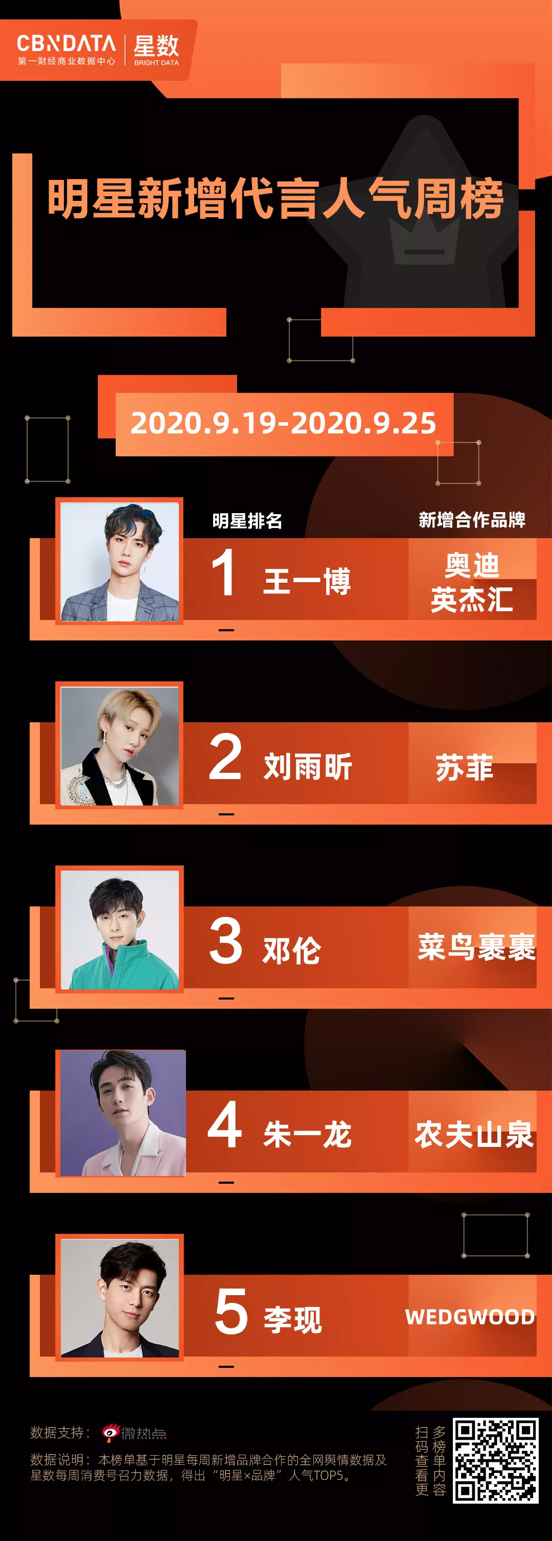 CBNData星数全新发布“明星新增代言人气周榜”及“明星代言周报”,聚焦美妆个护、食品饮料、家电3C、服饰鞋包、日化家清五大品类。