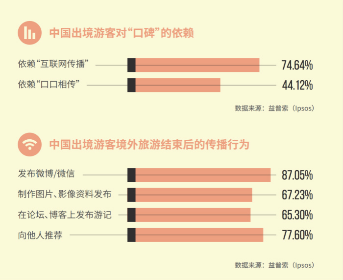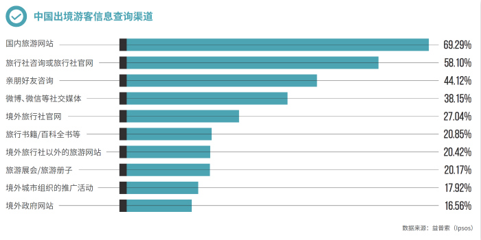 中国游客在境外旅游前,74.64% 的会加入相关微信群、QQ 群和论坛获取相关旅游信息,44.12% 的会向亲朋好友咨询。微信、微博等移动互联网媒体已成为中国游客传播旅游信息的最主要途径,其次为向他人的“口头推荐”。游记和博客也是推荐、传播旅游目的地必不可少的方式。
