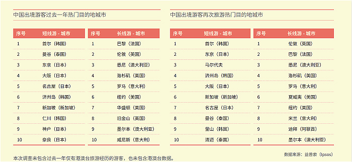 从旅游线路看,日韩和东南亚城市最热门。过去一年,中国出境游客短线旅游中选择最多的 10 个城市为:首尔、曼谷、东京、大阪、名古屋、济州岛、新加坡、仁川、神户和奈良。长线旅游中,欧洲、美国、澳大利亚“三分天下”,选择最多的 10 个城市为:巴黎、伦敦、悉尼、洛杉矶、罗马、纽约、华盛顿、旧金山、墨尔本和威尼斯。