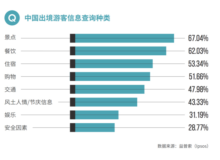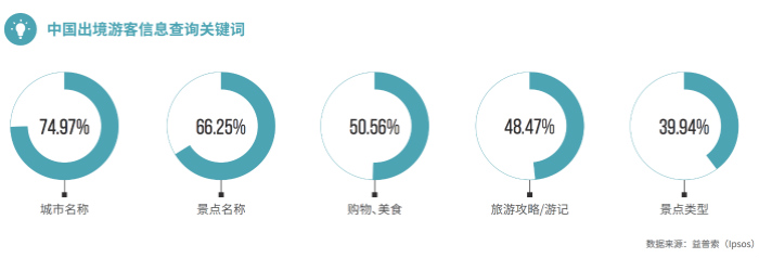 同时,超过一半的中国出境游客在出发前会查询与境外旅游城市相关的景点、餐饮、住宿和购物信息。在查询时,多以城市名称和景点名称为搜索关键词。