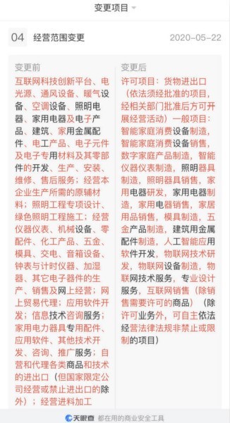 同日,其经营范围由传统的照明电工,到增加了互联网科技创新平台、家用电器及电子产品、建筑、家用金属配件等业务。