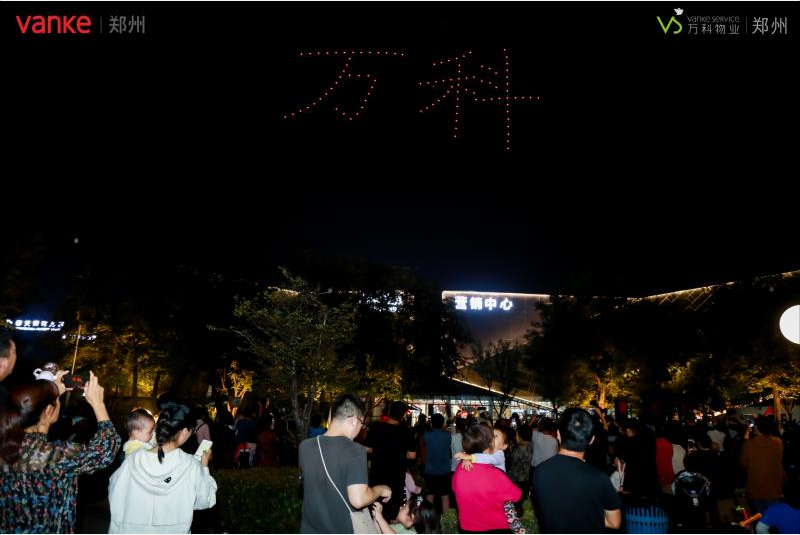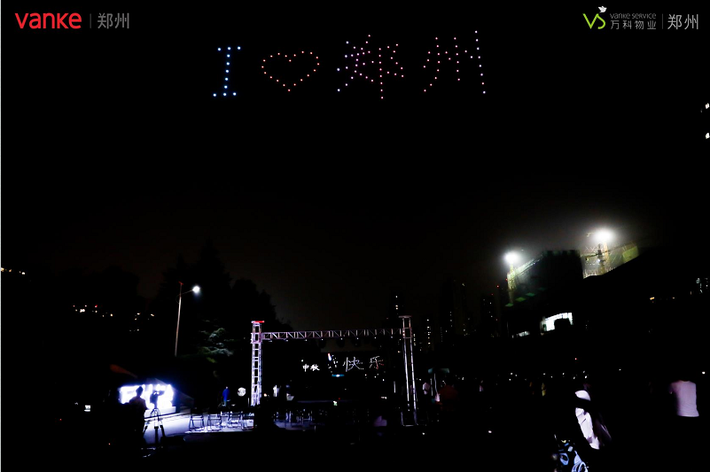 晚会临近闭幕,五百架无人机款款升空,在郑州万科的社区上空翩翩起舞,“中秋快乐”、“美好有豫、家在万科”、“我爱郑州”等字样点亮星空,一场30万+人的中秋盛会也在业主们的欢呼与喝彩中圆满落幕。