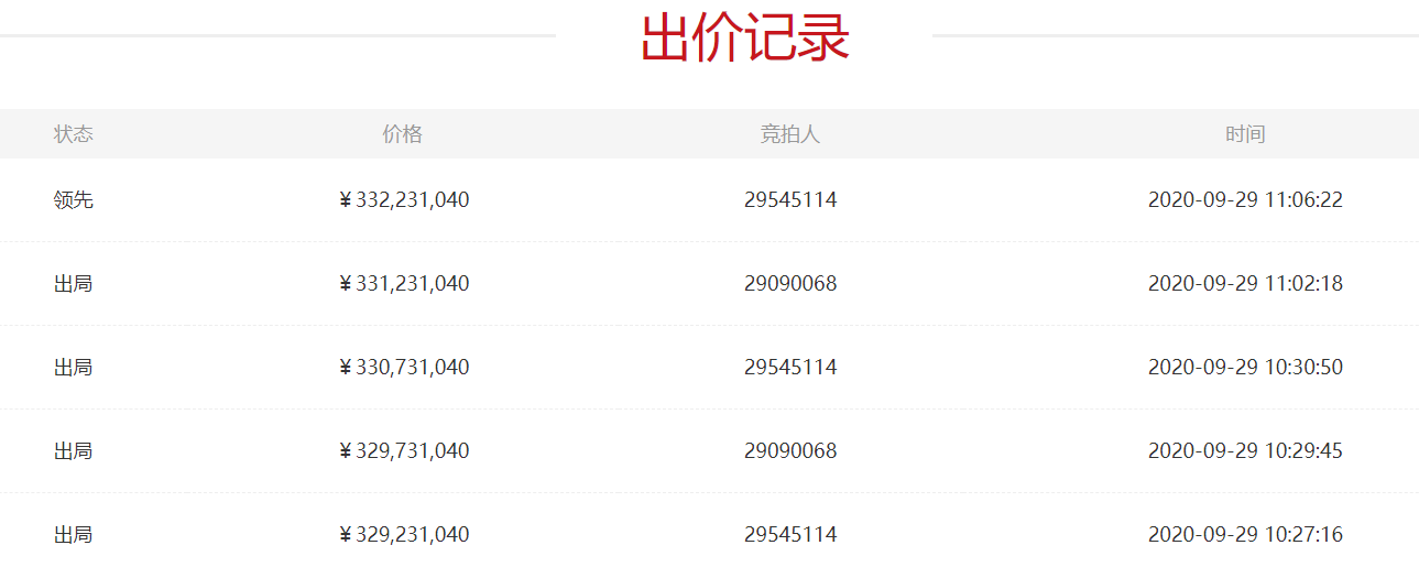 不过,由于竞拍持续一天时间,到9月30日10时截止,目前竞拍人具体身份尚未公布。按照法院规定,竞买成功后,竞买人(法定代表人、其他组织的负责人)须与委托代理人一同到法院办理交接手续,到法院签订成交确认书、领取标的。