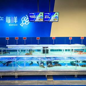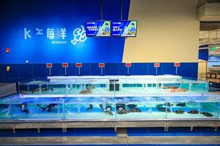 关于冻品和活鲜,山姆跟盒马有过话术交锋。这次,活鲜也被挑出来作为盒马X会员店的优势。在盒马X会员店内能看到活鱼池。而在山姆和Costco里,消费者只能找到冻的水产品。