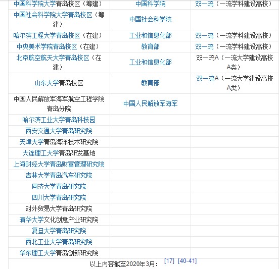 如中国科学院大学青岛校区(筹建)、中国社会科学院大学青岛校区(筹建)、哈尔滨工程大学青岛校区(在建)、中央美术学院青岛校区(在建)、北京航空航天大学青岛校区(在建)、山东大学青岛校区、海军航空工程学院青岛分院……