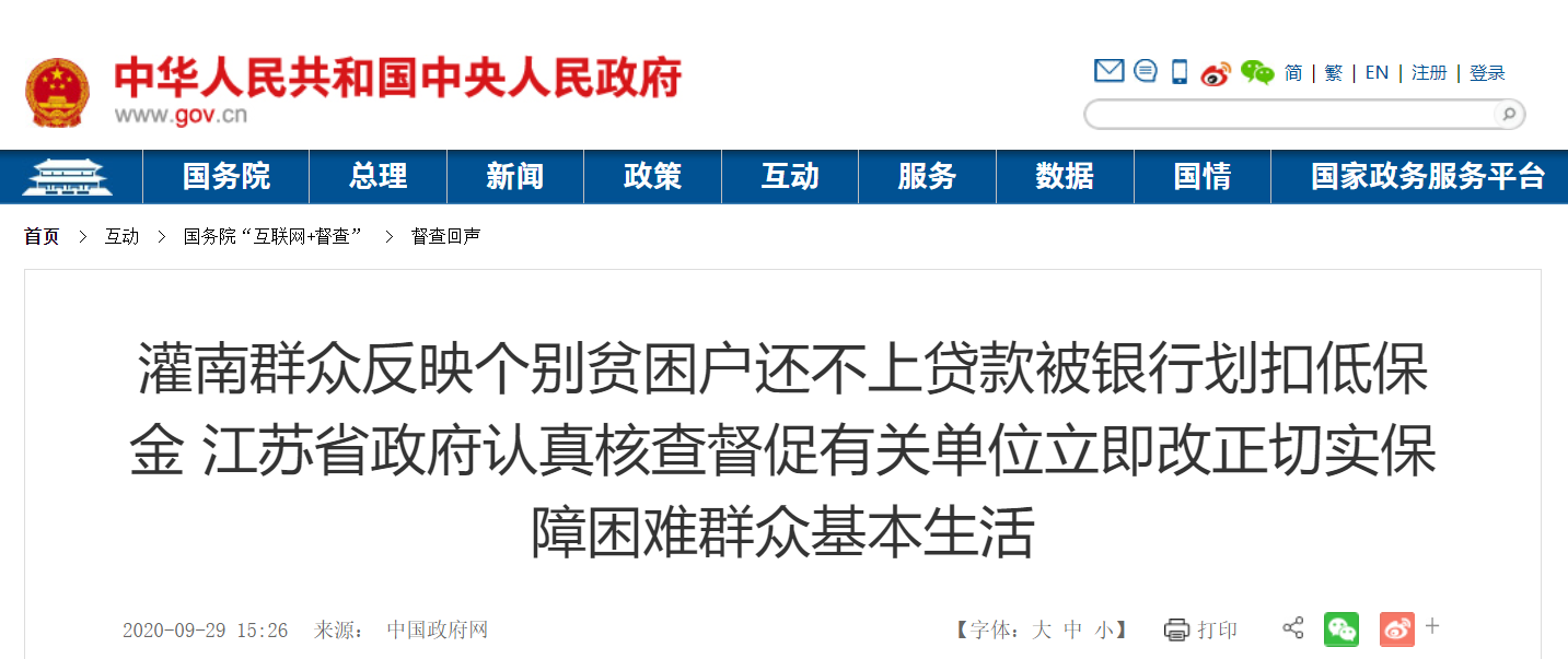 中国政府网消息,江苏庄先生2020年7月15日通过国务院“互联网+督查”平台反映,灌南县建档立卡贫困户小额扶贫贷款还款未考虑低保户生活困难实际,村里有低保户因未能及时还上贷款,银行直接划走了卡里的低保金。