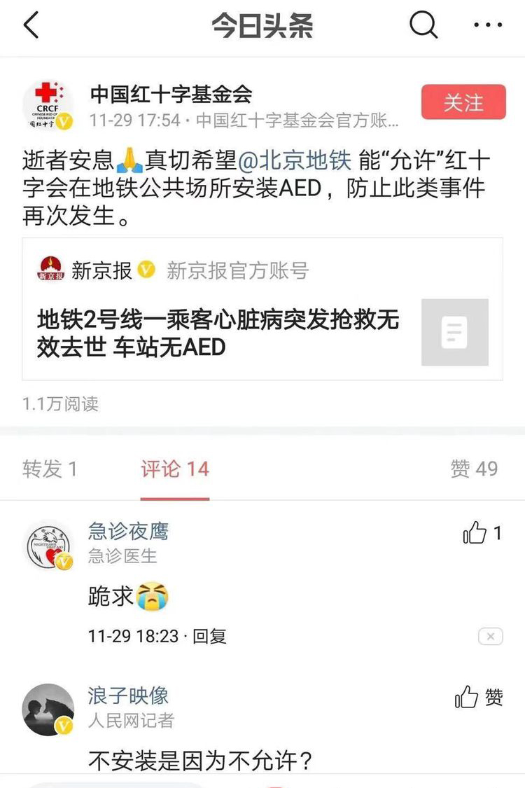 中国红十字会2019年11月在其认证的头条号上发文称,希望北京地铁“允许”红十字会在地铁安装AED,言下之意为地铁不允许安装。
