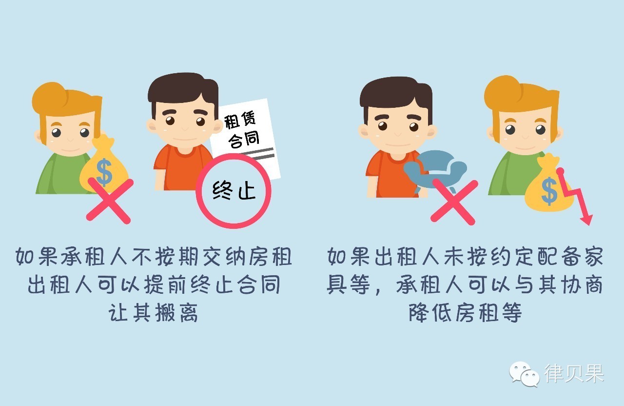 在签订合同时,双方就要想到可能产生的违反合同的行为,并在合同中规定相应的责任承担办法。(例如,如果承租人不按期交纳房租,出租人可以提前终止合同,让其搬离;如果出租人未按约定配备家具等,承租人可以与其协商降低房租等)