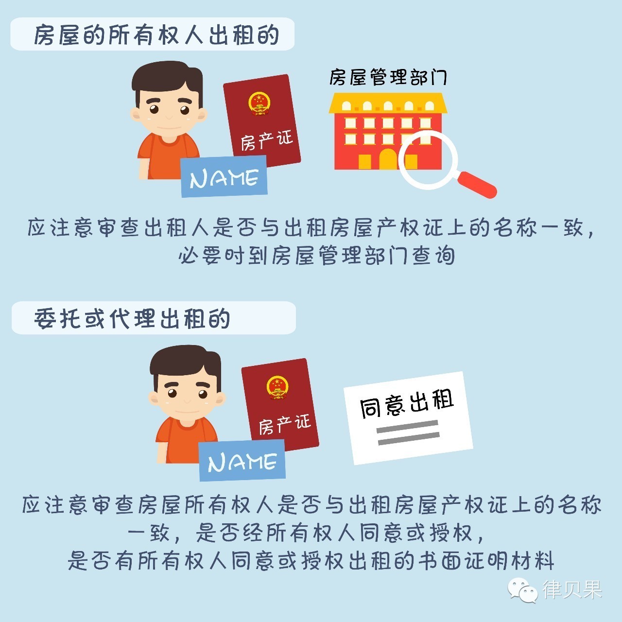 b) 委托或代理出租的:应注意审查房屋所有权人是否与出租房屋产权证上的名称一致,是否经所有权人同意或授权,是否有所有权人同意或授权出的租书面证明材料。