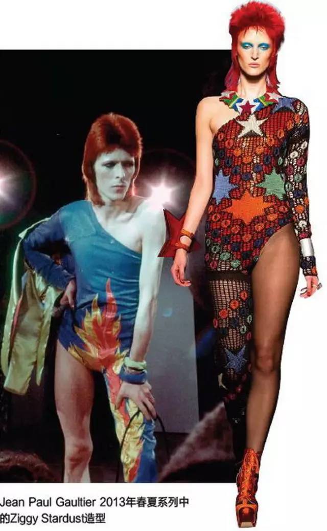 如 果翻看一下这两年的时装,你会发现大卫·鲍伊无所不在。Jean Paul Gaultier 的 2013 春夏系列中有这样一个造型,橙色打底的连体衣上修满了彩色的星星,袖子则只有左半边,裤腿只有右半边,还做成了渔网的形状,再加上标志性的蓝色眼影和红色 短发。这分明就是一个翻版的 Z 字星辰的造型。