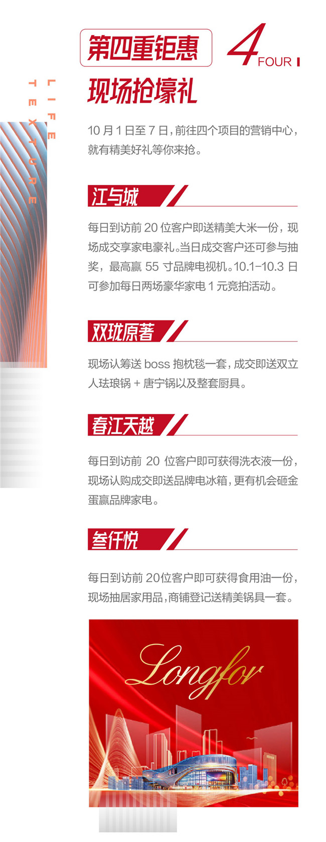 线上线下优惠开抢国庆中秋双节来临之际,南宁龙湖推出四重钜惠活动,百万壕礼线上线下热抢。南宁龙湖四个劲销红盘:江与城、双珑原著、春江天越、叁仟悦,全部上场!