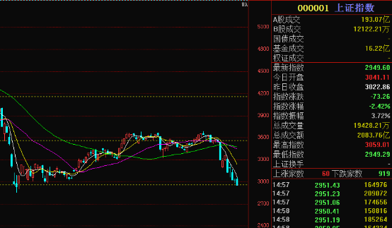周三市场早盘基本呈现震荡格式,午盘再度上演跳水状态。截止收盘上证指数报收:2949.6 跌幅-2.42%,深证指数报收:9978.8 跌幅-3.06% 两市成交额:5189.4亿。股指再次跌破3000点,进入二时代。