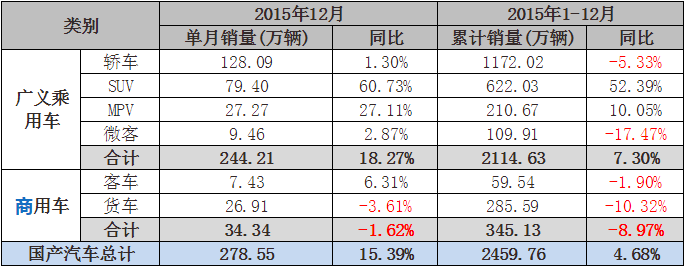 2015年增长4.68% 乘用车首次超过2000万辆。